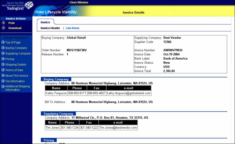 The GXS Order Lifecycle Visibility Invoice module supports e-invoicing and self-service invoice status inquiry. Vendors can create invoices, and seamlessly transmit them to the retailer's financial back-end system via the GXS